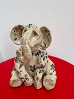 Seated elephant with flower decoration in blue, pink & gold.